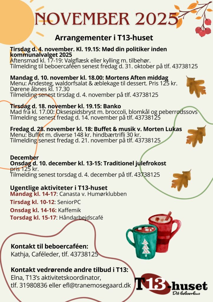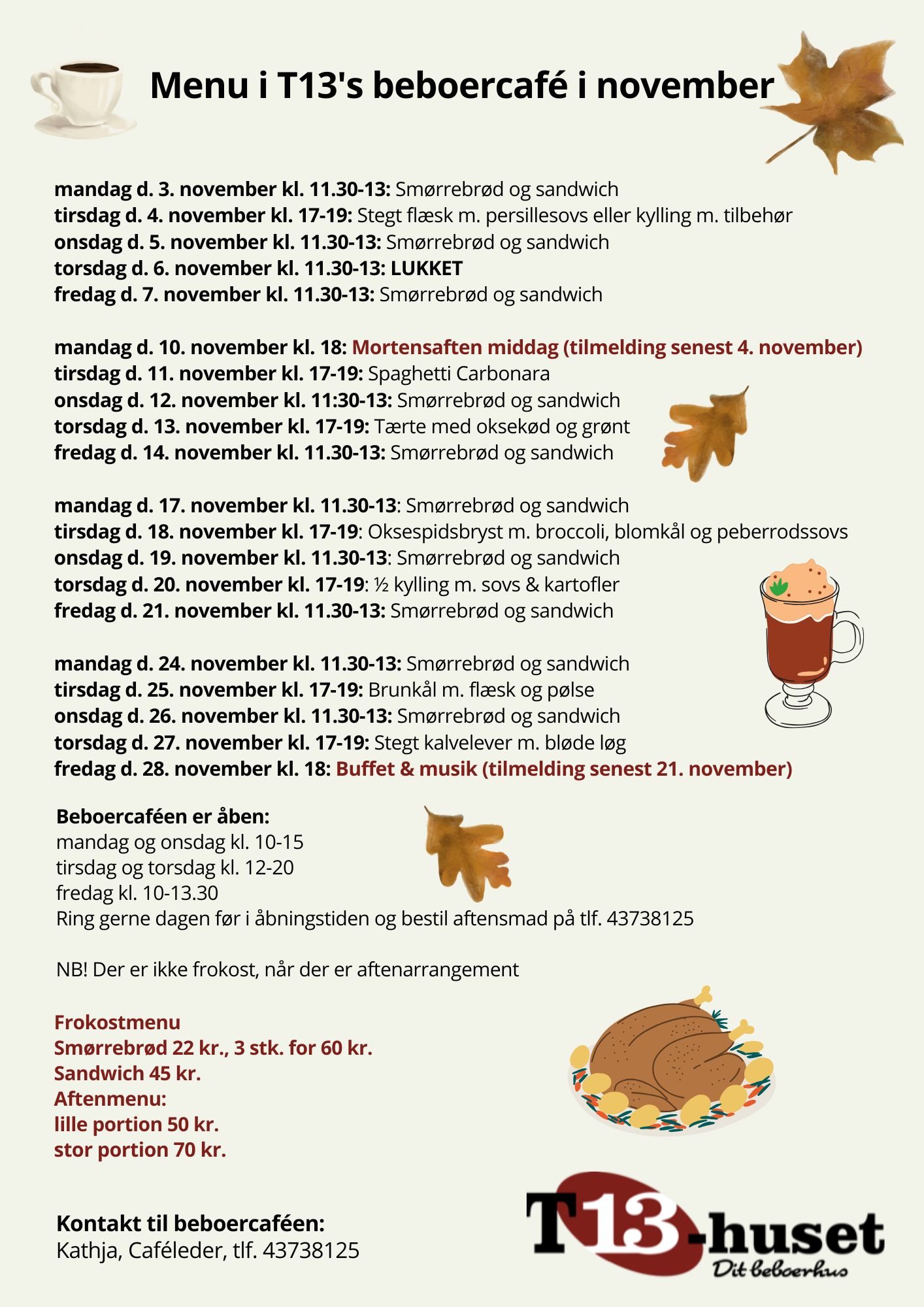 Menu i T13's beboercafé Følg med i beboercaféens menu for den kommende måned. Vi glæder os til at byde dig velkommen.
